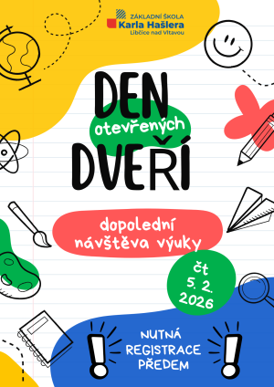 Srdečně vás zveme dne 5. 2. 2026 do naší školy! V rámci Dne otevřených dveří bude možné po předchozím přihlášení nahlédnout do výuky. Více informací a online formulář pro přihlášení naleznete po rozkliknutí příspěvku.