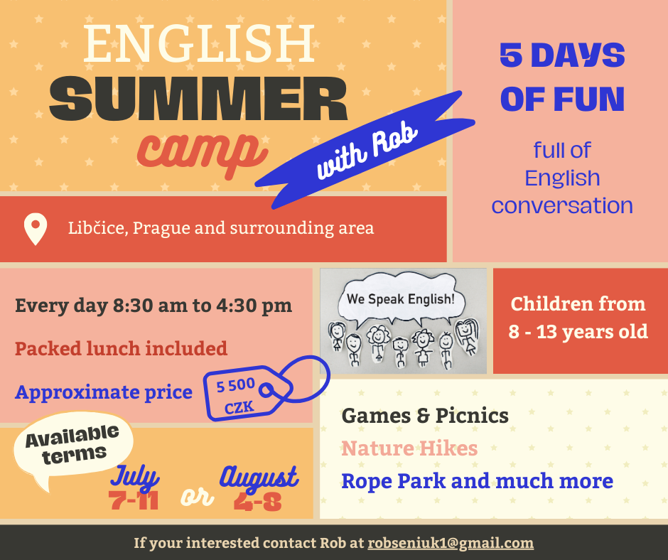 nabízí možnost uspořádání letního příměstského tábora plného zábavných aktivit a anglické konverzace. Možné termíny jsou 7. - 11. 7. nebo 4. - 8. 8. 2025. Děti s Robem vyrazí na výlety do Prahy, zahrají si hry uvnitř i venku, vyzkouší si lanové centrum nebo jinou podobnou aktivitu. Tábor je určený dětem od 8 do 13 let.
