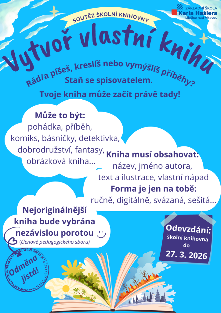 Staň se autorem vlastní knihy a zapoj se do soutěže školní knihovny! Informace, jak se do soutěže zapojit, naleznete v přiloženém letáčku.