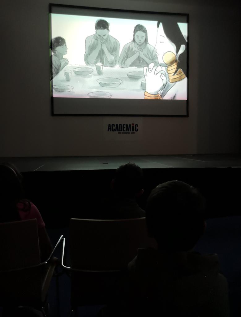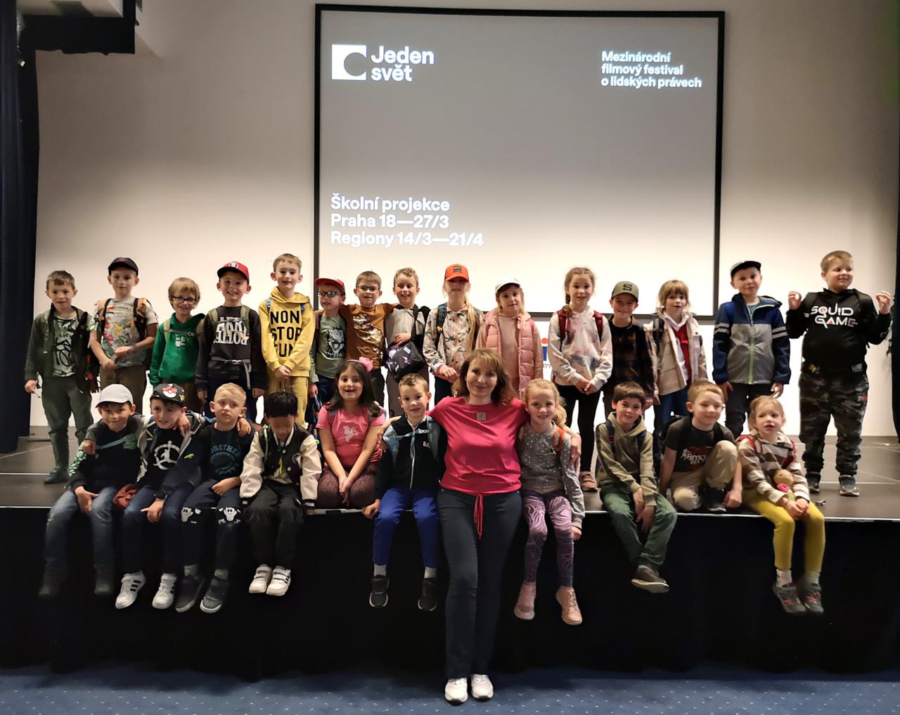 Prvňáčci na školní projekci v rámci Mezinárodního festivalu filmů o lidských právech Jeden svět společnosti Člověk v tísni v Roztokách u Prahy